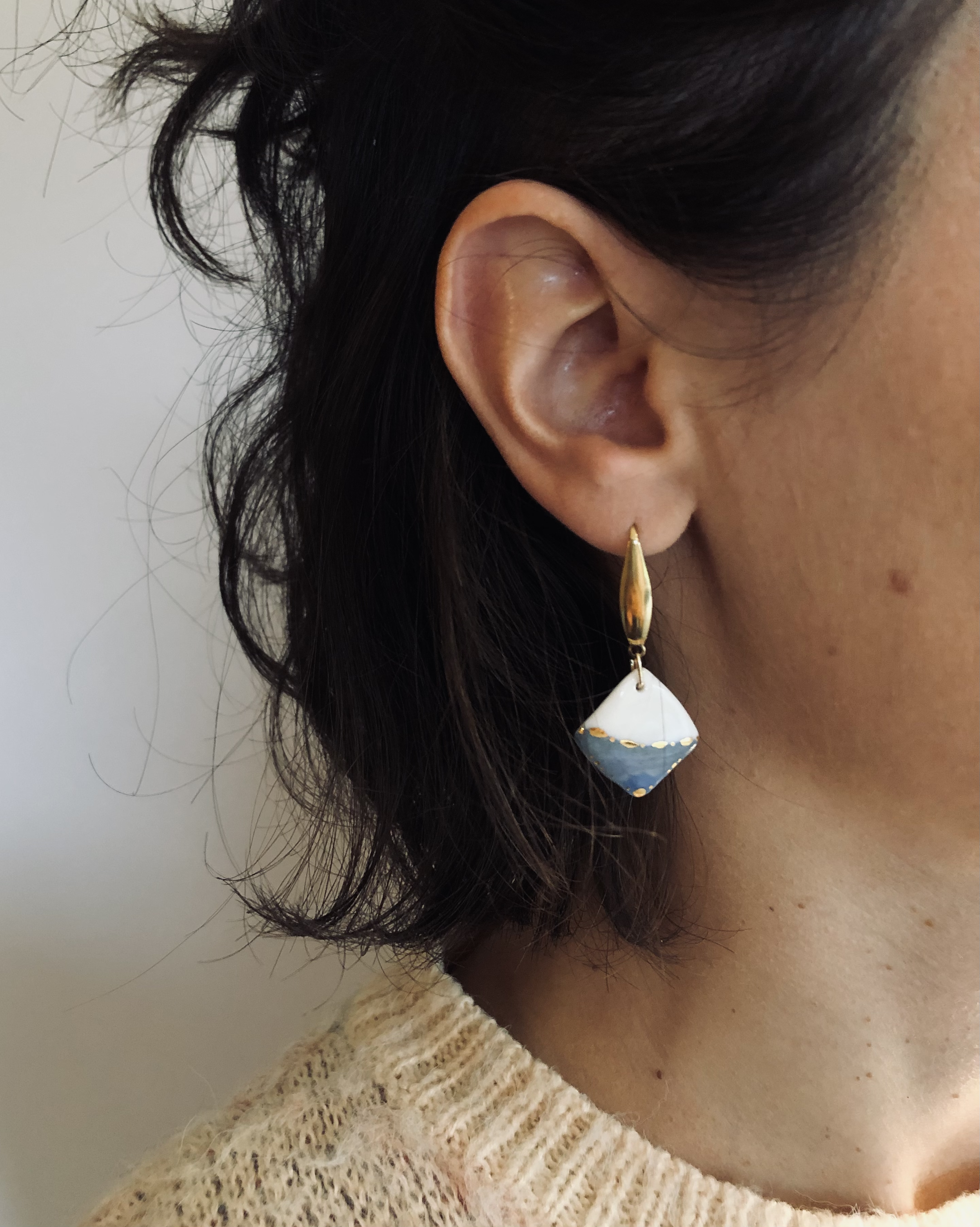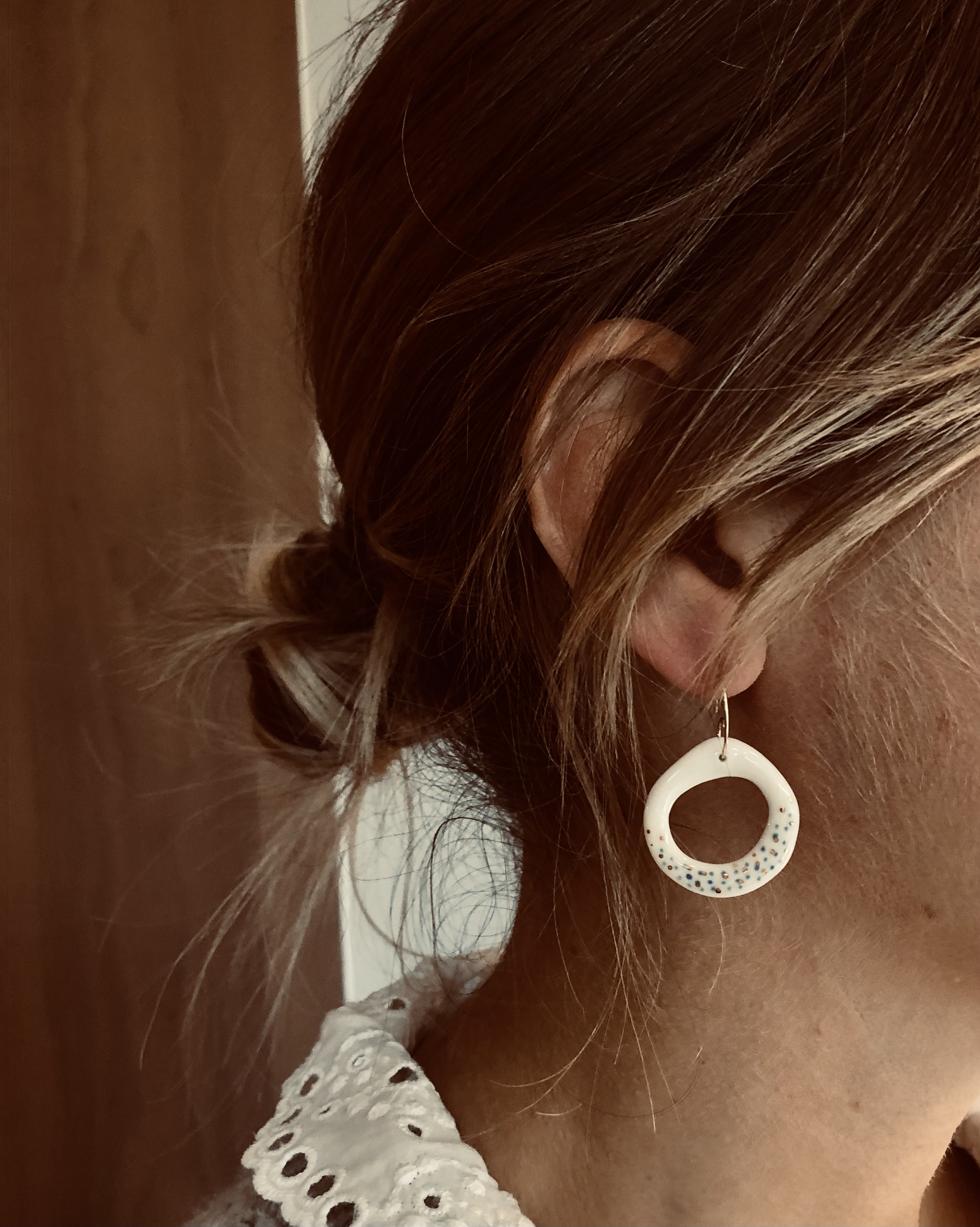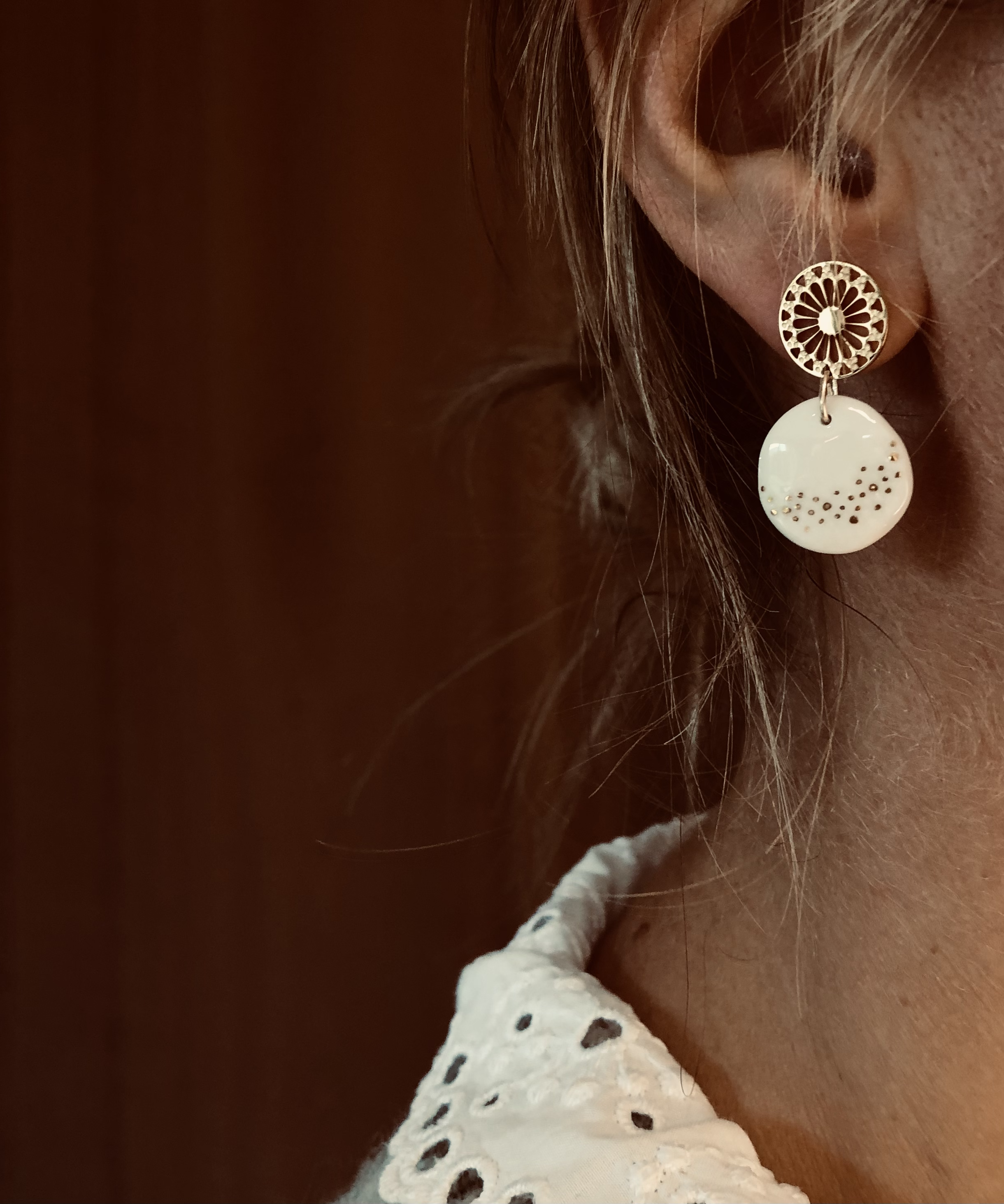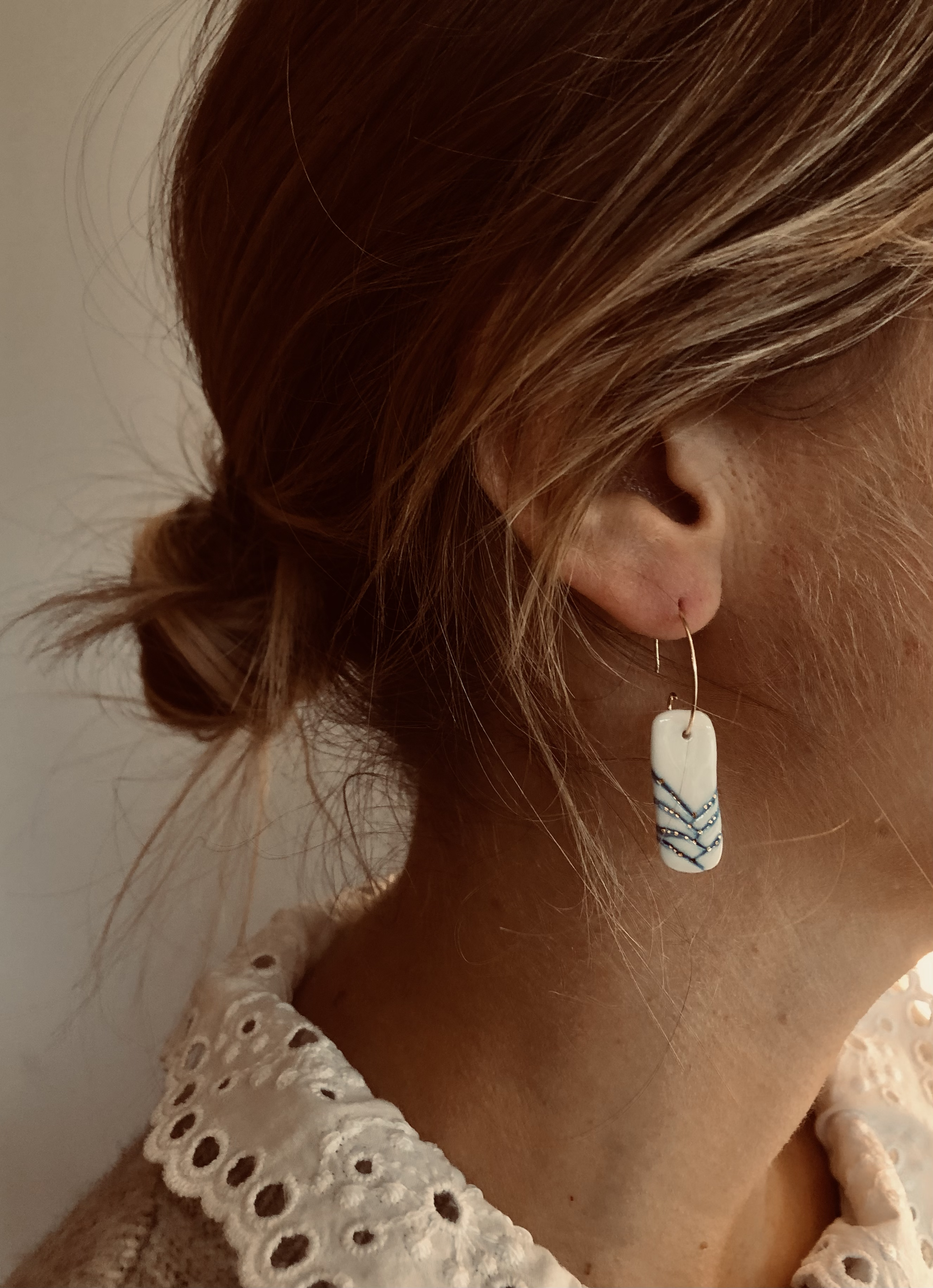 Porcelaine blanche vitrifiée surmontée d’un lustre d’or. Formes et motifs uniques dessinés ou gravés à la main. Apprêts en acier inoxydable ou gold filled.