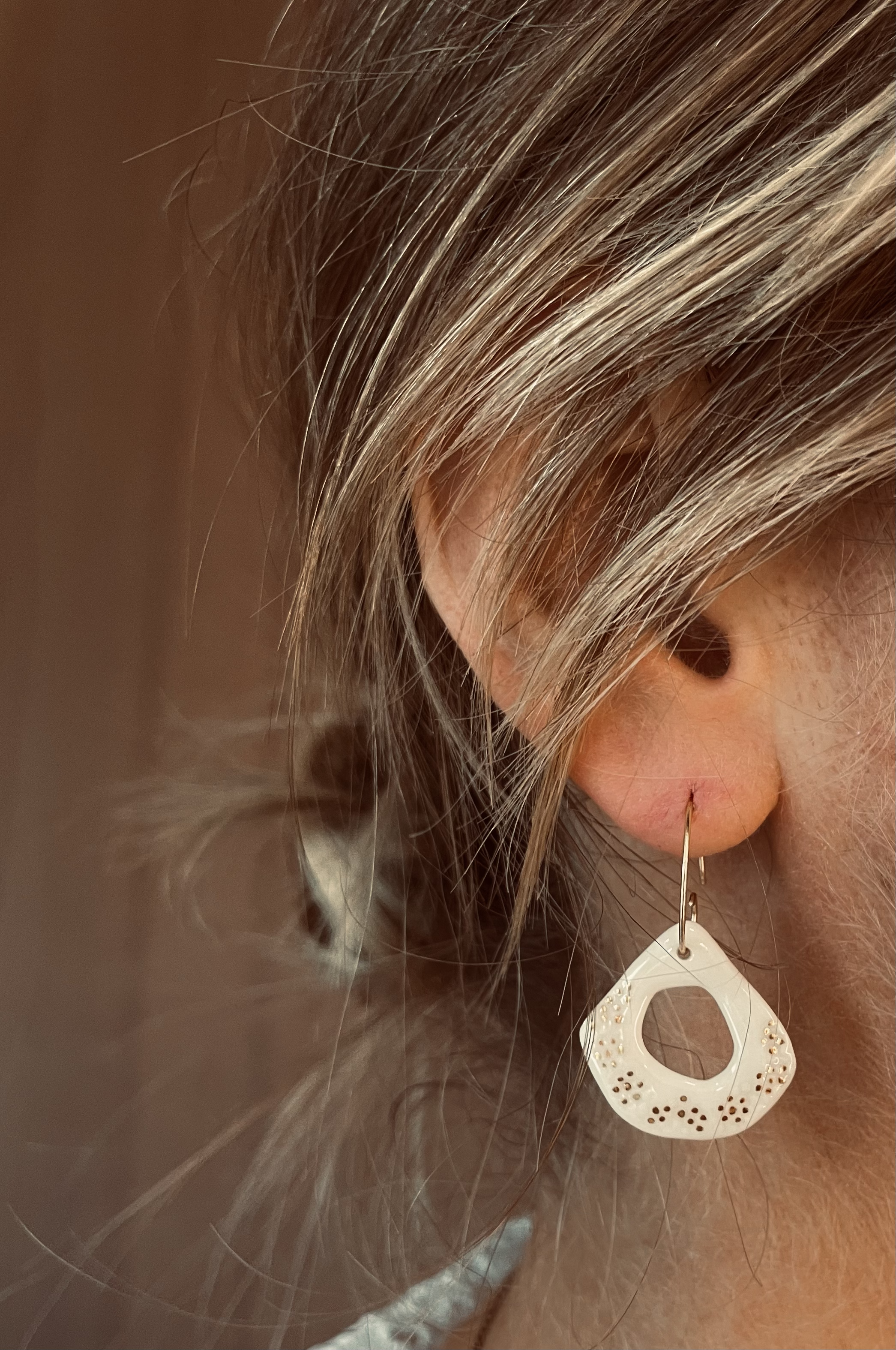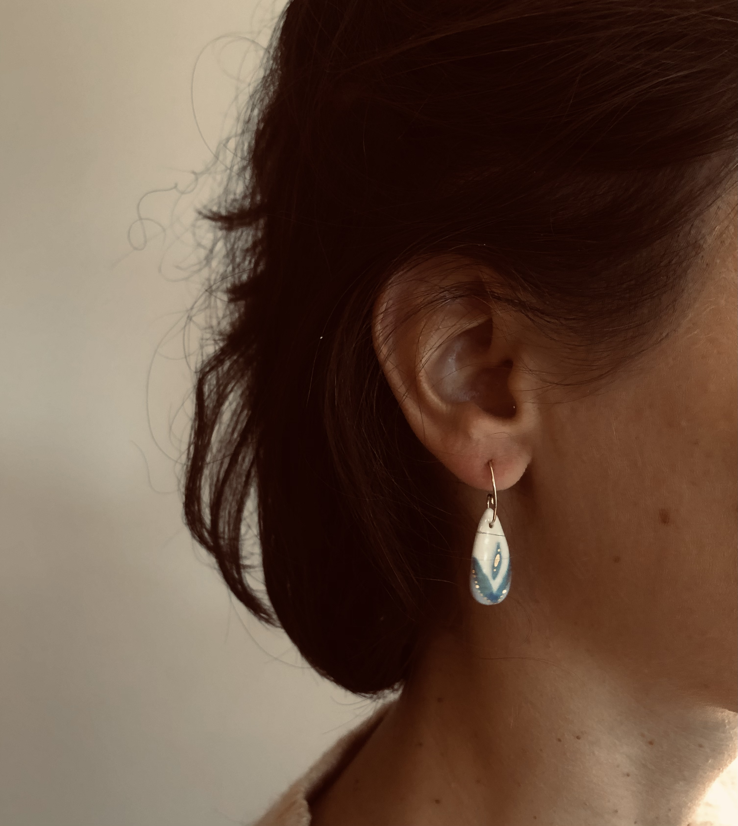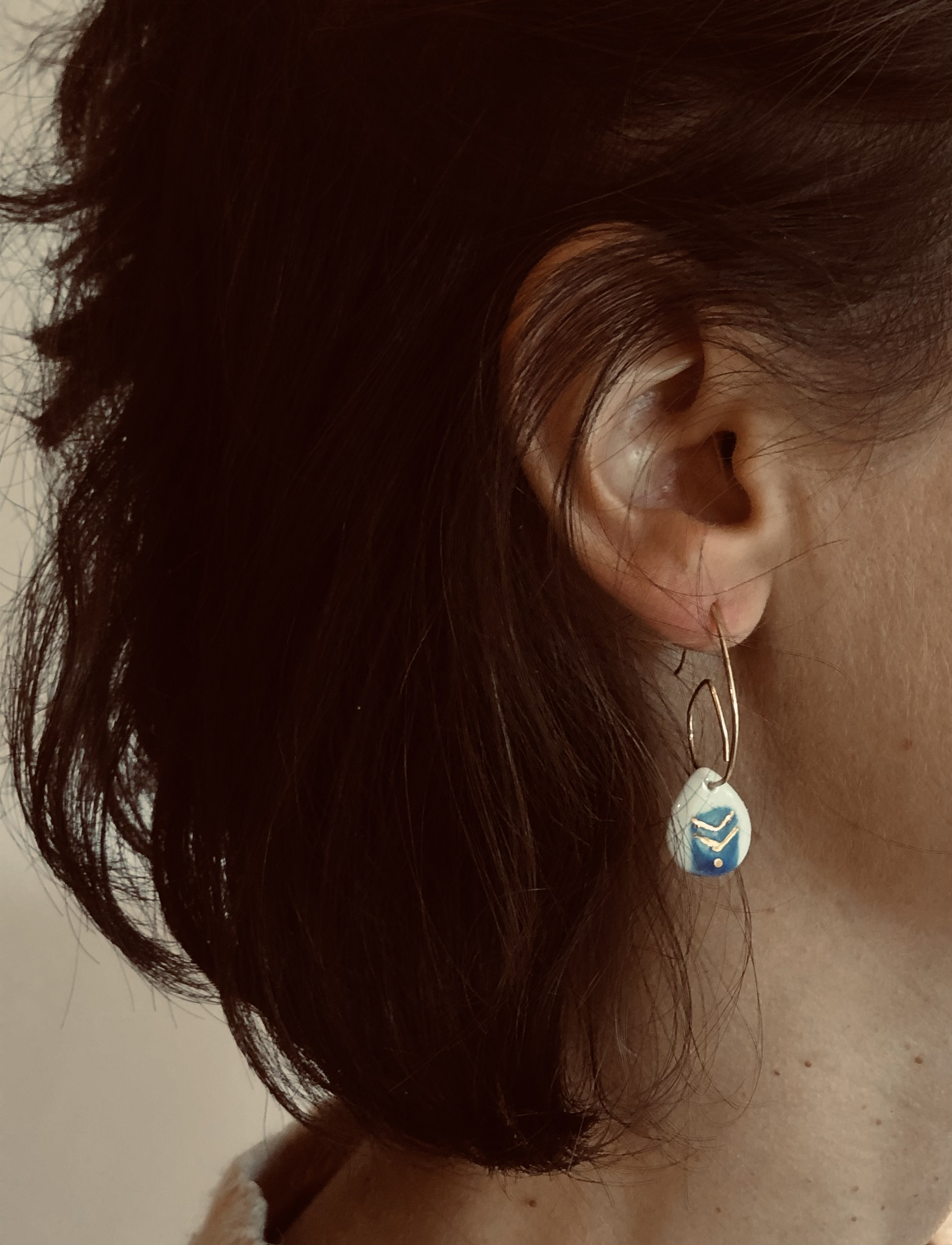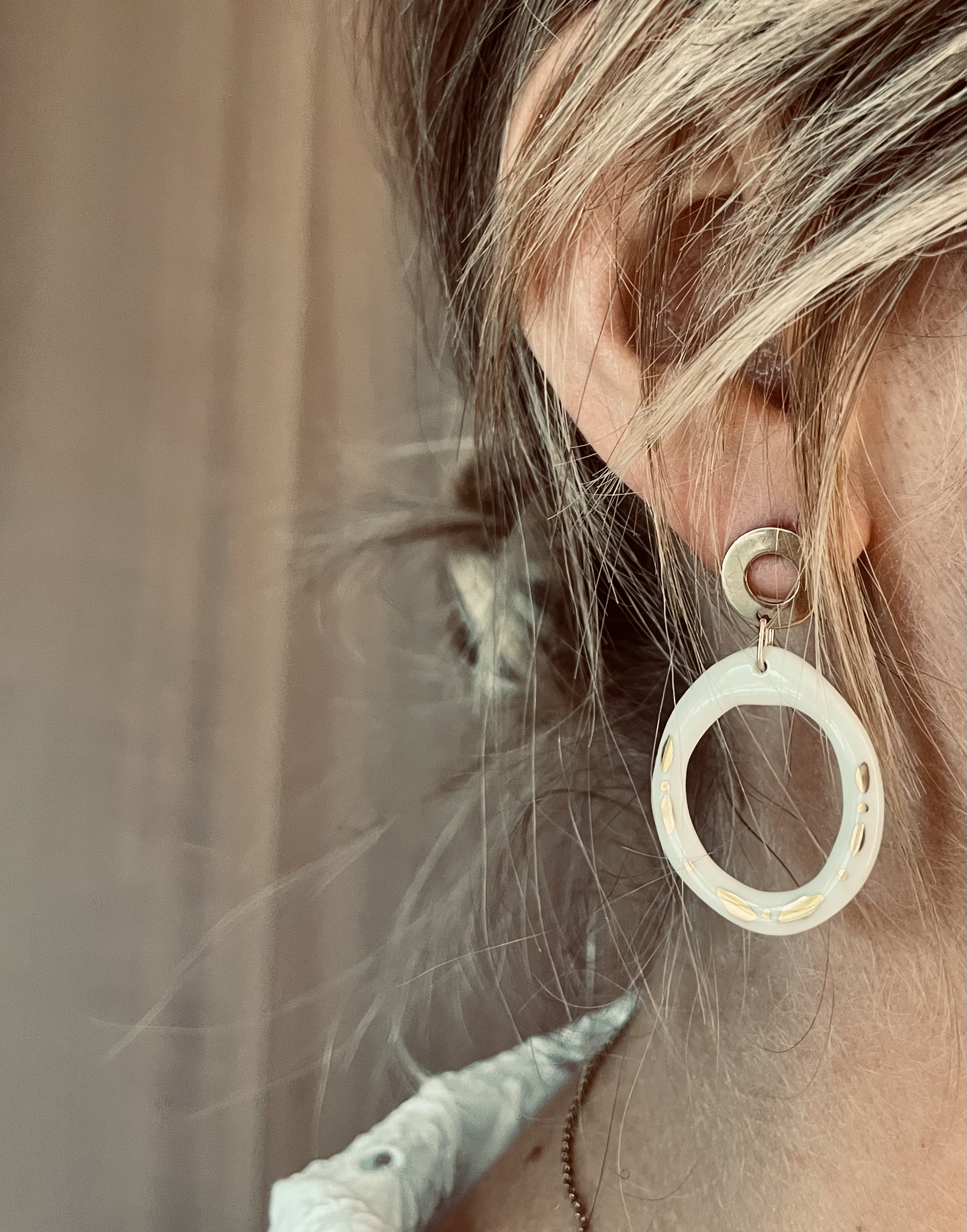 Porcelaine blanche vitrifiée surmontée d’un lustre d’or. Formes et motifs uniques dessinés ou gravés à la main. Apprêts en acier inoxydable ou gold filled.