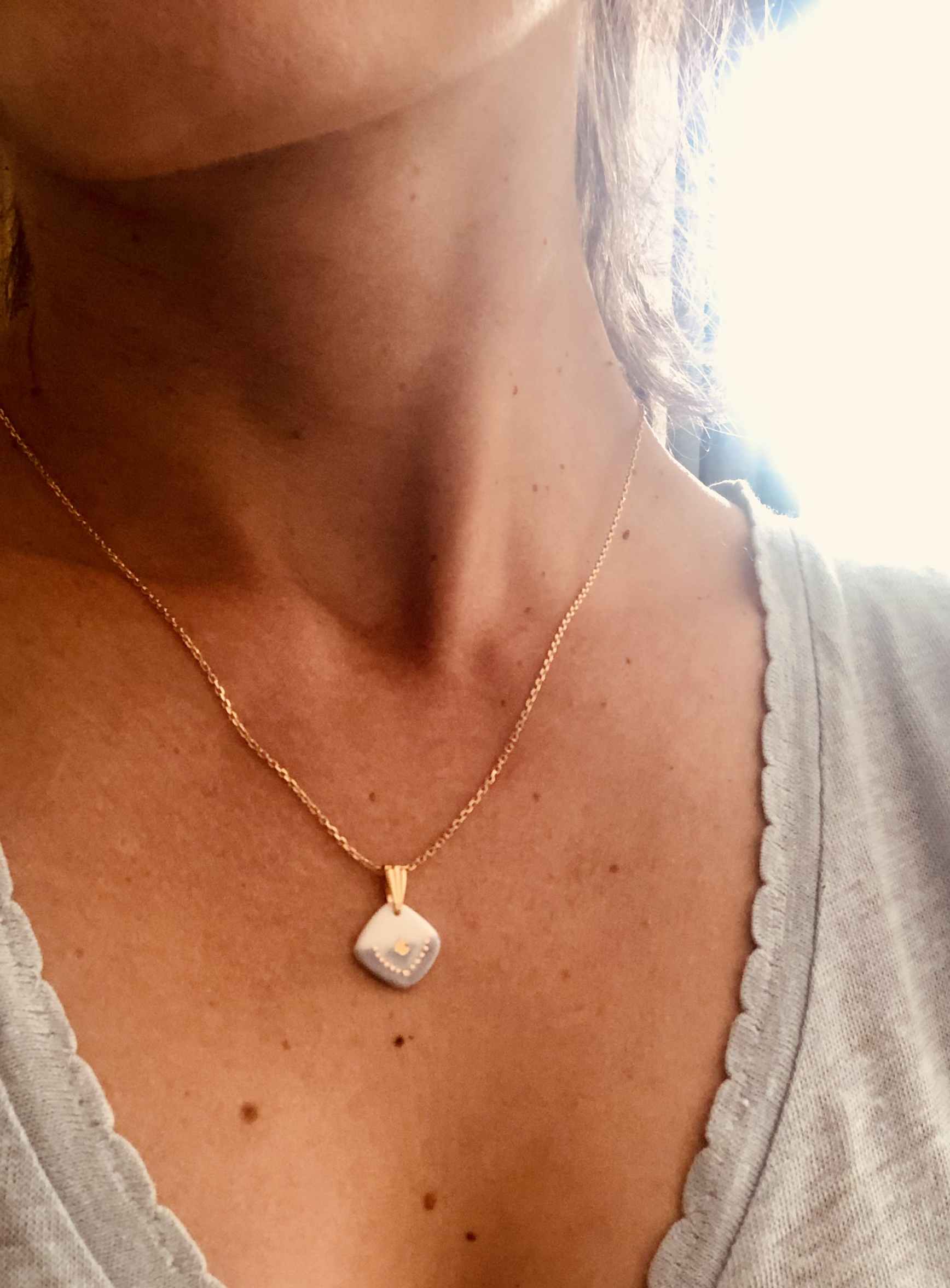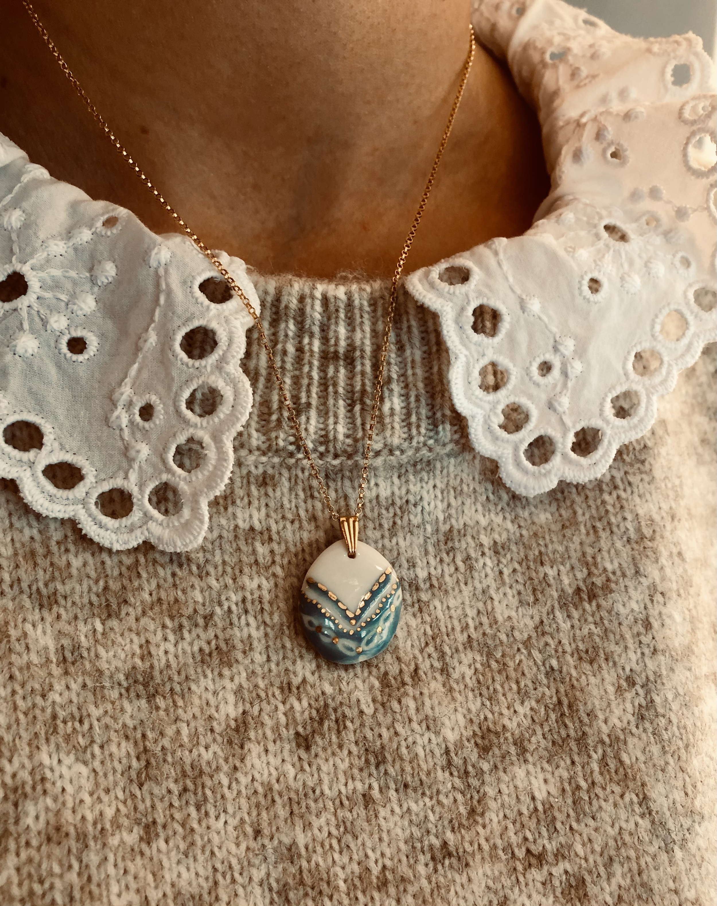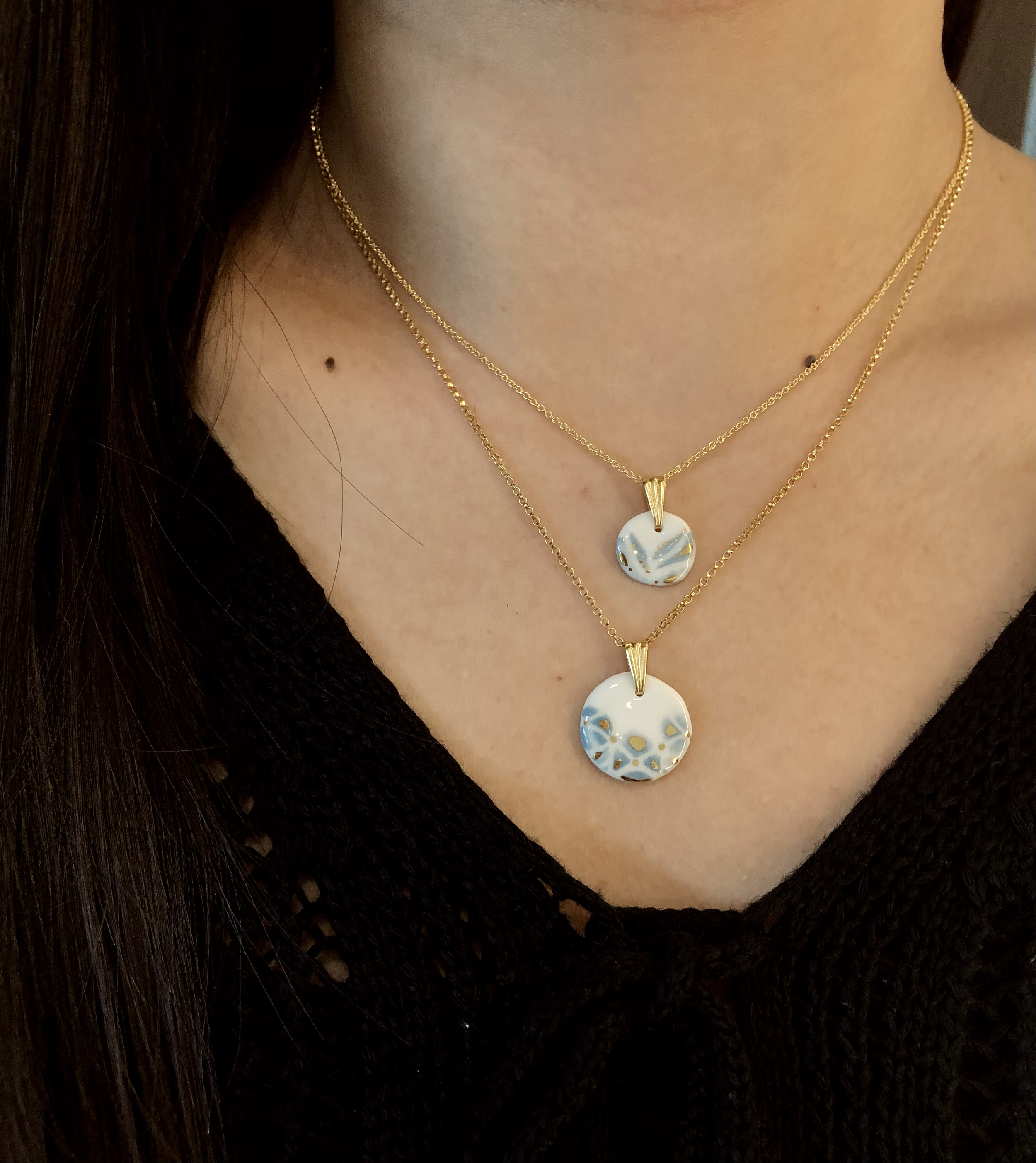 Porcelaine blanche vitrifiée surmontée d’un lustre d’or. Formes et motifs uniques dessinés ou gravés à la main. Bélières en acier inoxydable et chaines en gold filled.