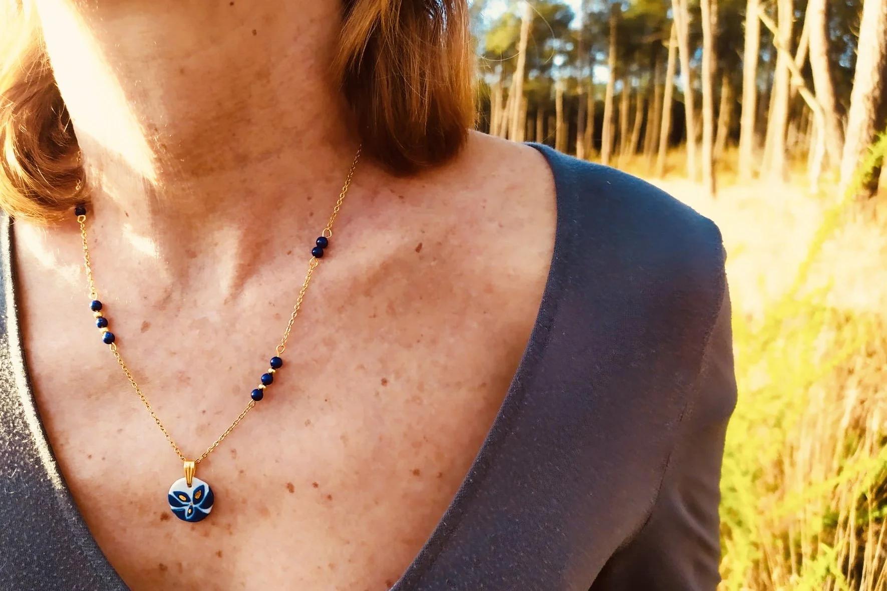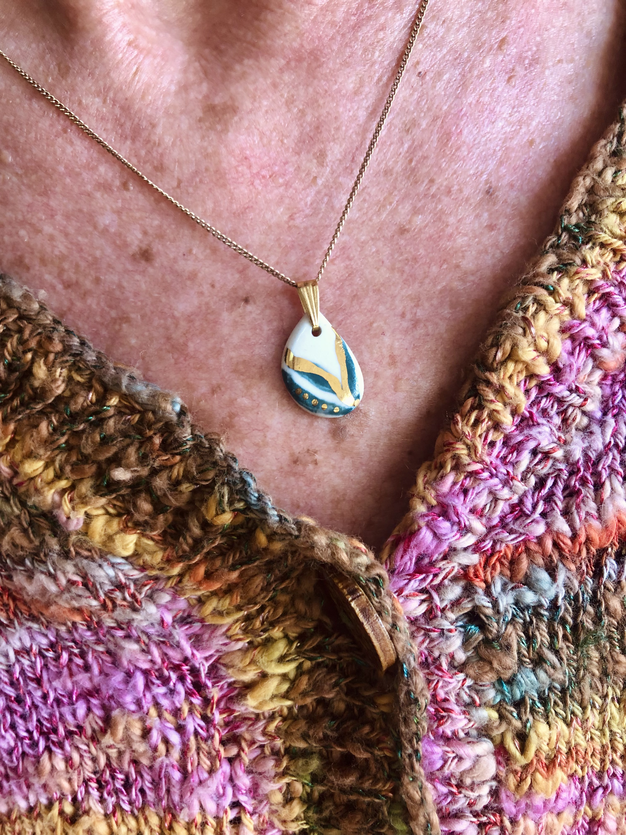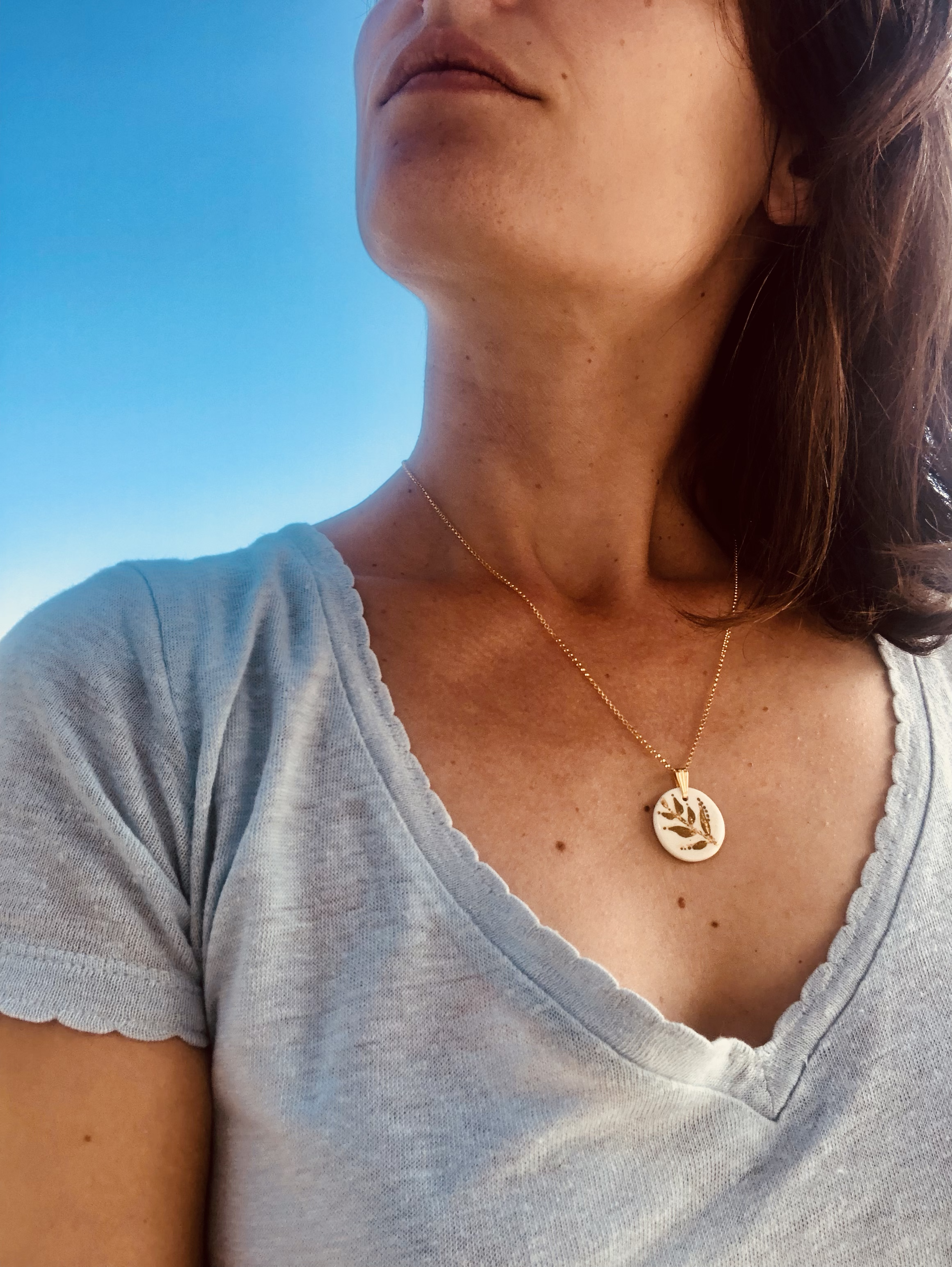 Porcelaine blanche vitrifiée surmontée d’un lustre d’or. Formes et motifs uniques dessinés ou gravés à la main. Bélières en acier inoxydable et chaines en gold filled.